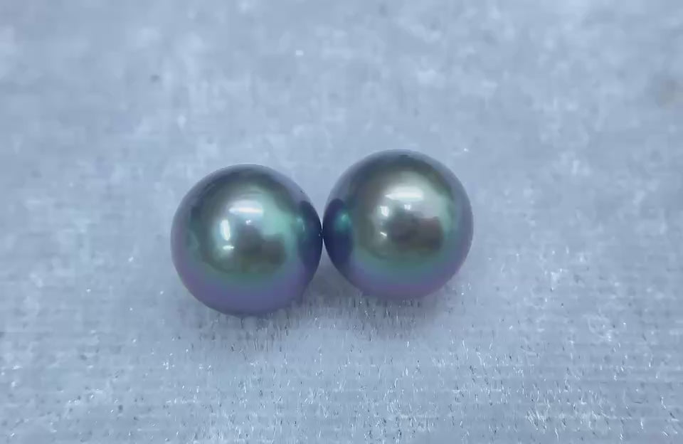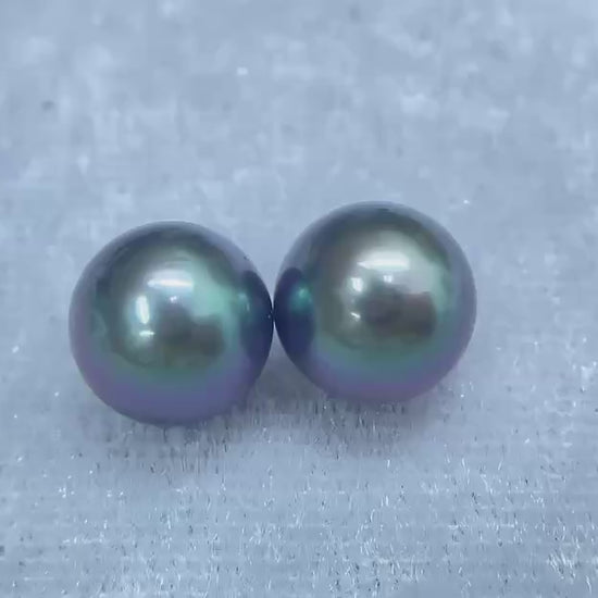 High quality malachite green with purple overtone Tahitian pearls earrings studs