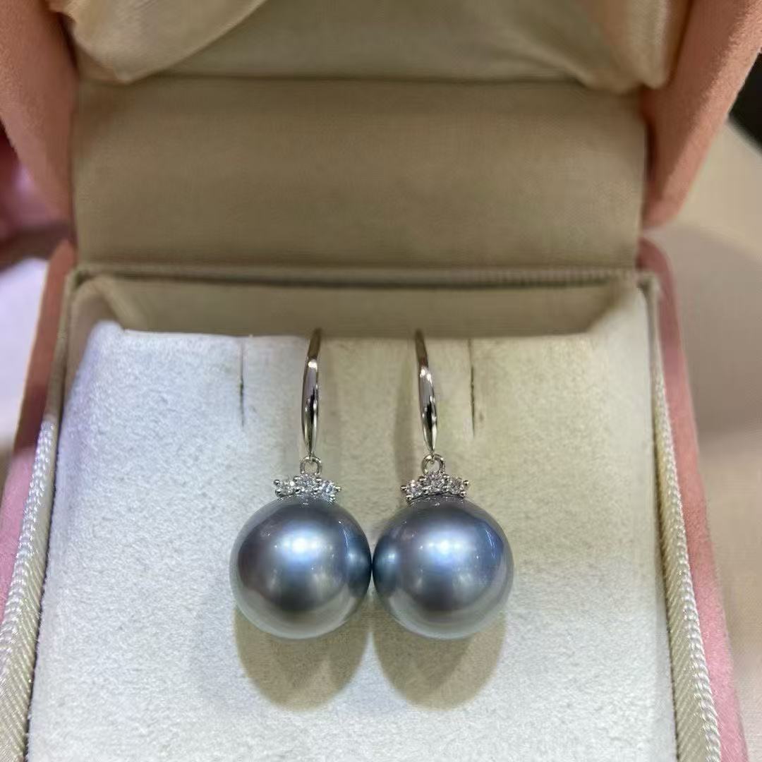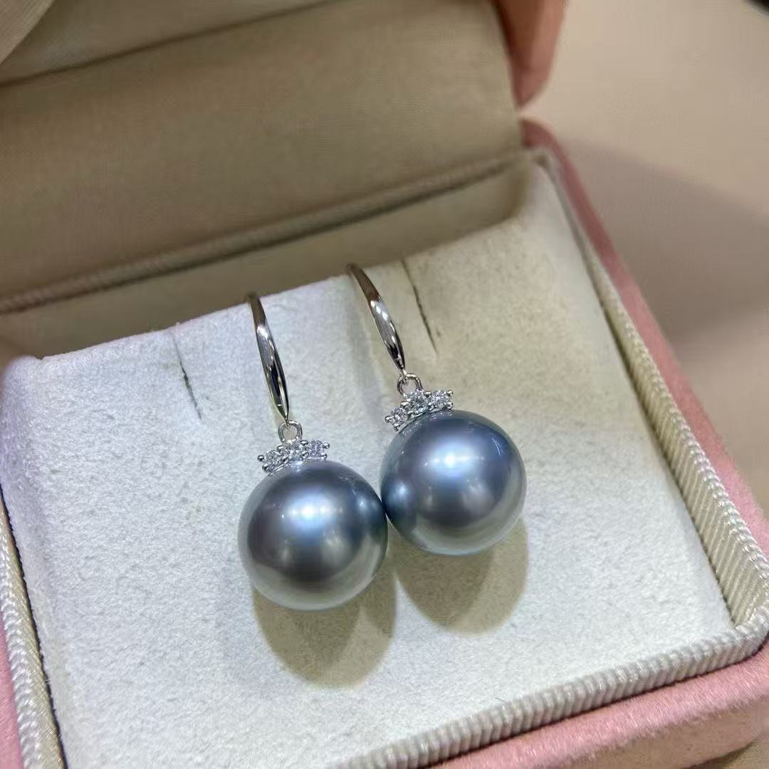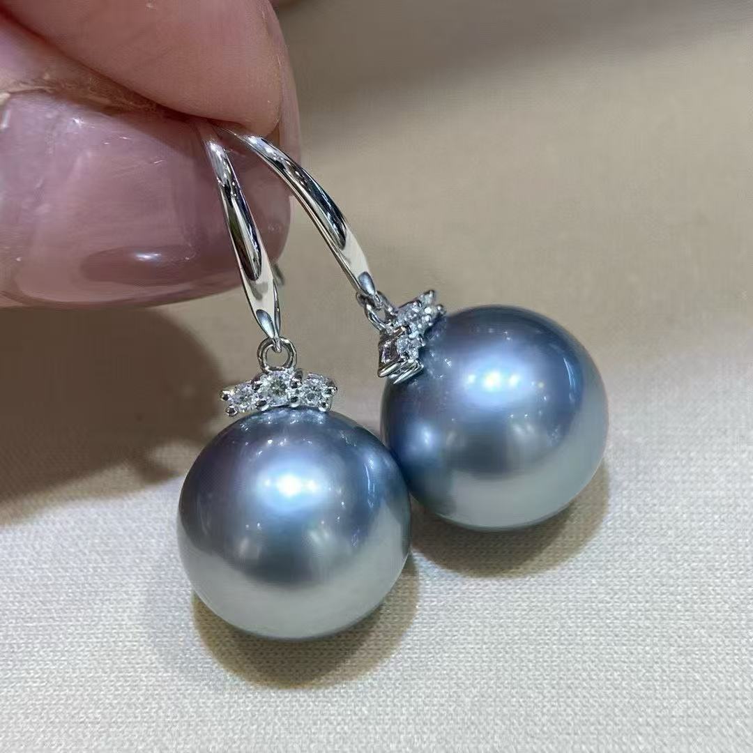 High quality “Ocean blue”platinum grey color Tahitian pearls earrings