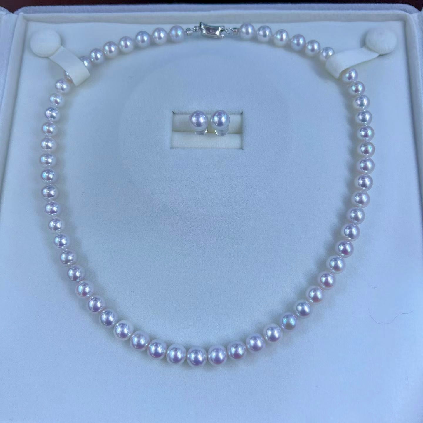 Top quality aurora white with pink color overtone freshwater akoya pearls necklace & earrings a set